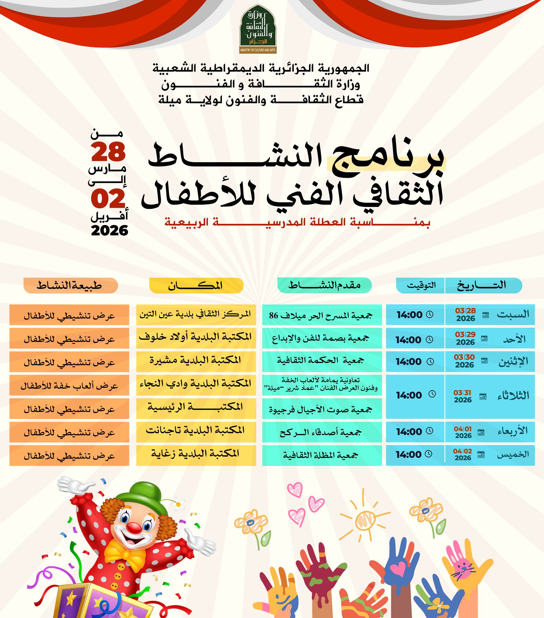 برنامج النشاط الثقافي الفني للأطفال لولاية ميلة بمناسبة العطلة المدرسية الربيعية 2026