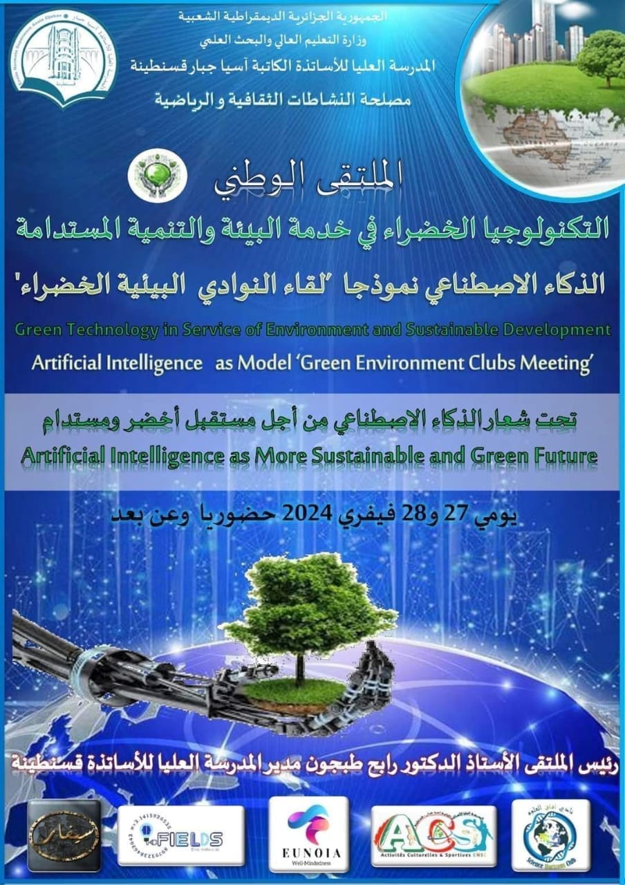 #إرسالية_رقم 04 بتاريخ 09 جانفي 2024 من مديرية الحياة الطلابية بخصوص الدعوة للمشاركة في فعاليات الملتقى الوطني حول: » التكنولوجيا الخضراء في خدمة البيئة و التنمية المستدامة الذكاء الإصطناعي نموذجا « لقاء النوادي البيئية الخضراء » تحت شعار الذكاء الإصطناعي من أجل مستقبل أخضر و مستدام « وذلك خلال يومي 27و28 فيفري 2024.