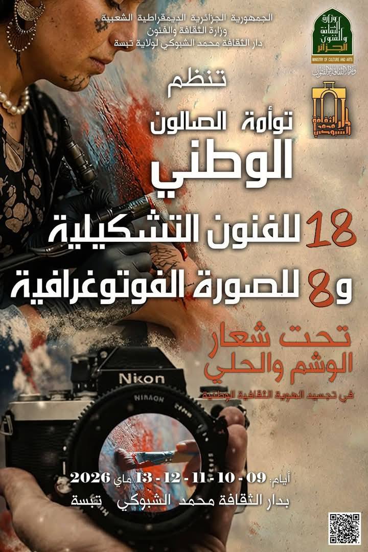 تتهيّأ مدينة تبسة، تلك الجوهرة الأثرية في أقصى الشرق الجزائري، لاستضافة حدثٍ فني بارز يجمع بين أصالة الموروث الثقافي وحداثة التعبير البصري، إذ تنظّم دار الثقافة محمد الشبوكي بتبسة، تحت إشراف وزارة الثقافة والفنون، الدورة الثامنة عشرة من الصالون الوطني للفنون التشكيلية، مقرونةً بالدورة الثامنة من الصالون الوطني للصورة الفوتوغرافية، وذلك خلال الفترة الممتدة من 9 إلى 13 ماي 2026