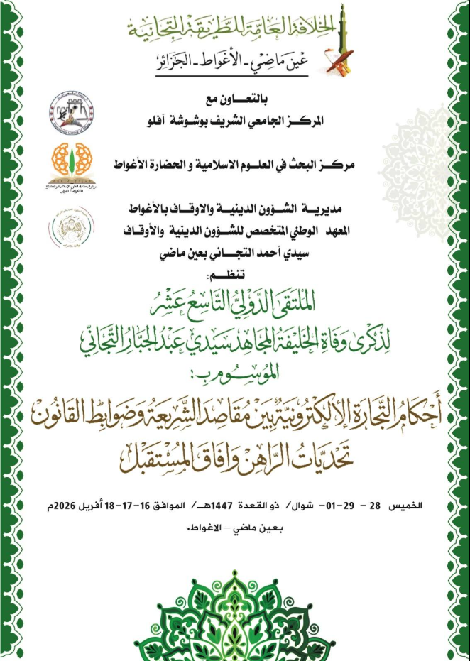 موضوع الملتقى: أحكام التجارة الإلكترونية بين مقاصد الشريعة وضوابط القانون: تحديات الحاضر وآفاق المستقبل