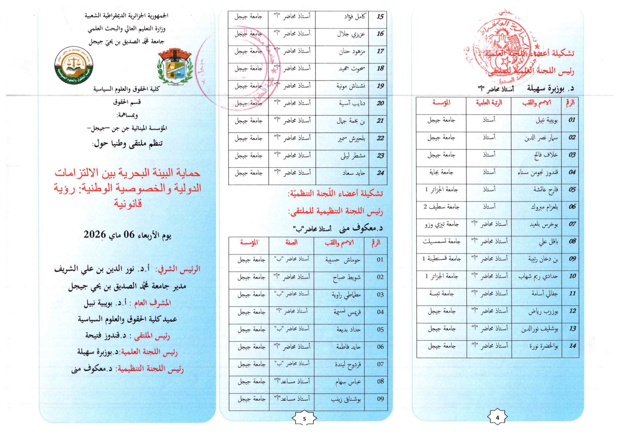 ينظم قسم الحقوق بكلية الحقوق والعلوم السياسية بـ جامعة محمد الصديق بن يحيى -جيجل-، وبالتنسيق مع المؤسسة المينائية جن جن -جيجل-، ملتقى وطنياً حضورياً بعنوان: « حماية البيئة البحرية بين الالتزامات الدولية والخصوصية الوطنية: رؤية قانونية »، وذلك يوم الأربعاء الموافق لـ 06 ماي 2026