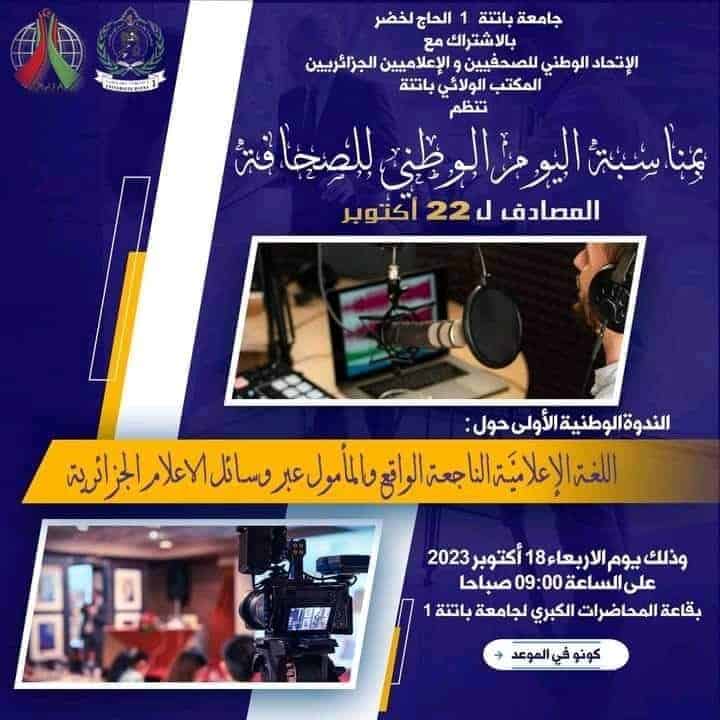 جامعة باتنة 1 الحاج لخضر و بالاشتراك مع الإتحاد الوطني للصحفيين و الإعلاميين الجزائريين المكتب الولائي باتنة تنظم و بمناسبة اليوم الوطني للصحافة 22 أكتوبر الندوة الوطنية الأولى حول اللغة الإعلامية الناجحة الواقع و المأمول عبر وسائل الإعلام الجزائرية و ذلك يوم الأربعاء 18 أكتوبر 2023 على الساعة 09:00 صباحا بقاعة المحاضرات الكبرى لجامعة باتنة 1 كونوفي الموعد
