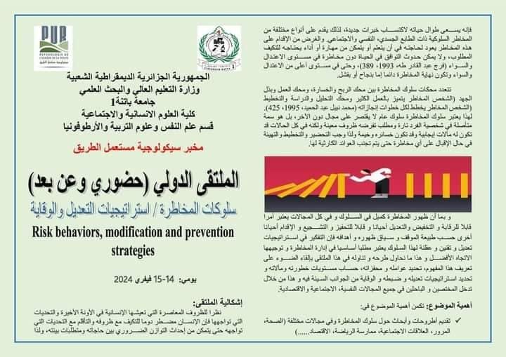 تقديم أطروحات وأبحاث حول سلوك المخاطرة وفي مجالات مختلفة (الصحة التي تواجهها فإن الإنسان مضطر دوما للتكيف مع ظروفه والتأقلم مع التحديات التي المرور العلاقات الاجتماعية، ممارسة الرياضة، الاقتصاد……. تواجهه حتى يتمكن من إحداث التوازن المروري بين حاجاته ومتطلبات بينته، ولذا
