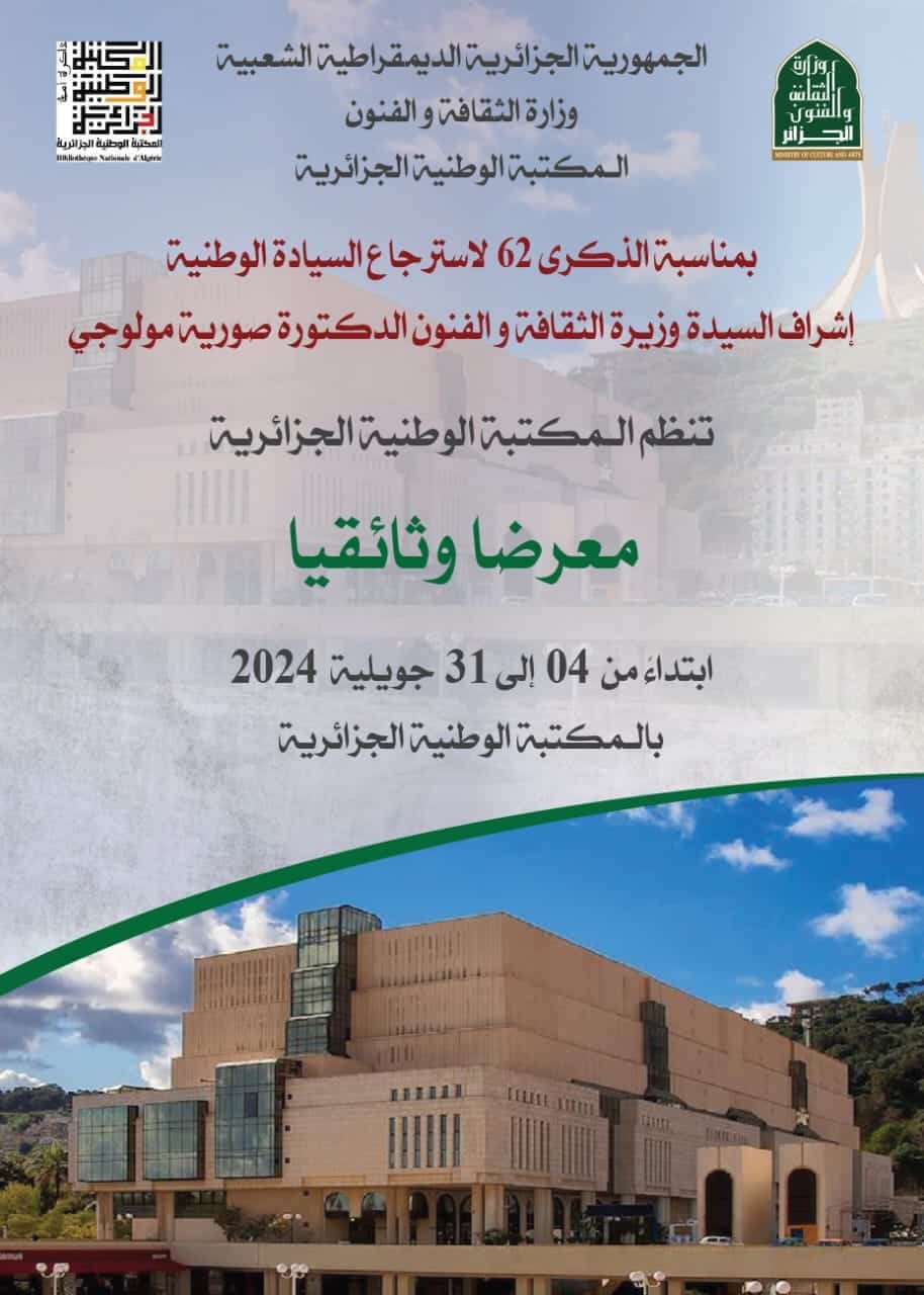 تحت إشراف السيدة وزيرة الثقافة والفنون الدكتورة صورية مولوجي، تحتفل المكتبة الوطنية الجزائرية بذكرى استرجاع السيادة الوطنية الـ62 من خلال تنظيم معرض وثائقي مميز. يبدأ المعرض في 4 جويلية ويستمر حتى 31 جويلية 2024.