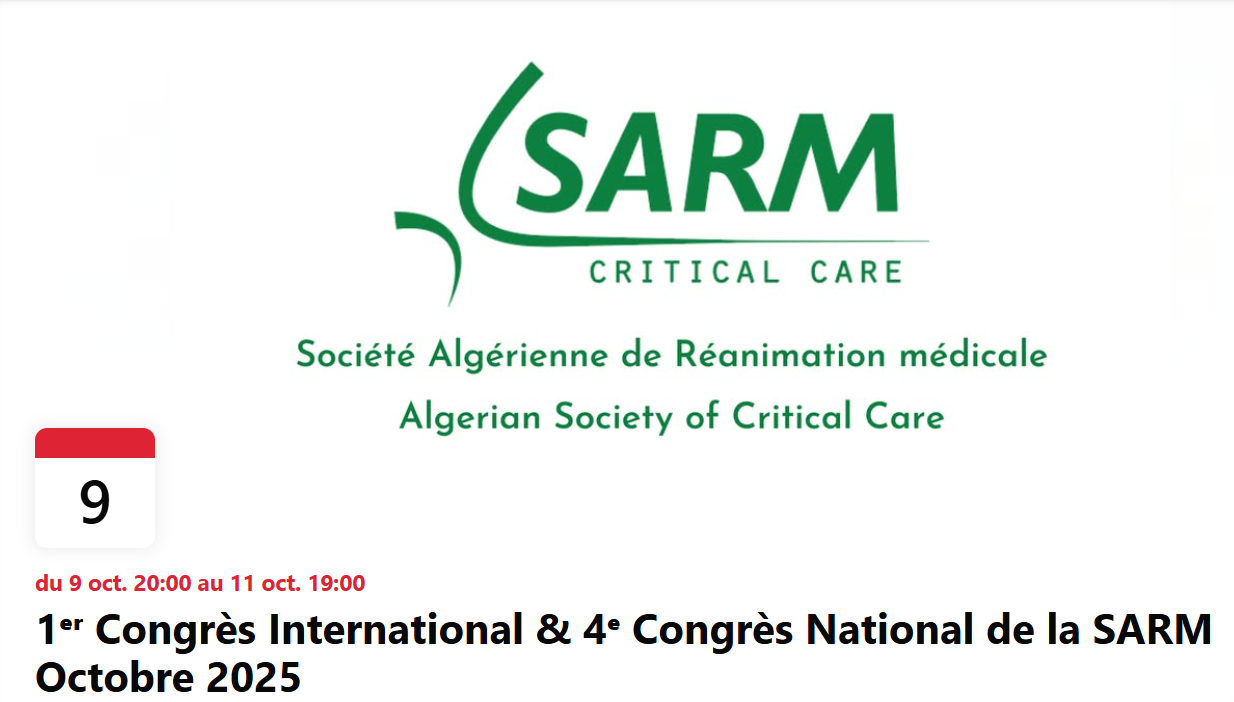 La Société Algérienne de Réanimation Médicale (SARM) est heureuse de vous inviter à la tenue de son 1er Congrès International conjointement à son 4ᵉ Congrès National, prévu du 9 au 11 octobre 2025 à l’École Supérieure d’Hôtellerie et de Restauration d’Alger (ESHRA).