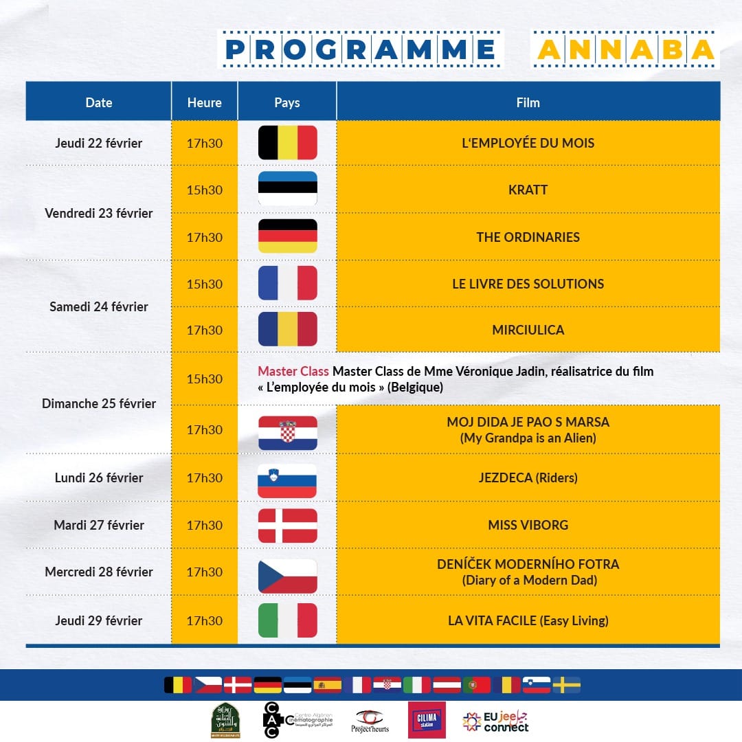 Prêts pour le coup d’envoi des 8èmes Journées du Film Européen ? Découvrez nos programmes de projections cinémathèque d’Annaba du 22 au 29 février !