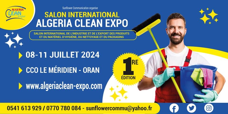 Salon International de l’Industrie et de l’Export des Produits et du Matériel d’Hygiène, du Nettoyage et du Packaging «ALGERIA CLEAN EXPO», que nous organisons du 08 au 11 juillet 2024 au Centre de Conventions d’Oran (CCO/ Le Méridien).