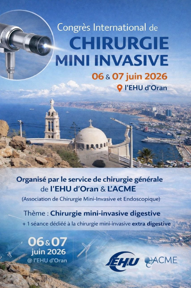 Le Service de Chirurgie Générale et Laparoscopique de l’EHU d’Oran et l’Association de Chirurgie Mini-Invasive et Endoscopique (ACME) ont l’honneur de vous inviter à leur 1er congrès de chirurgie mini-invasive.
