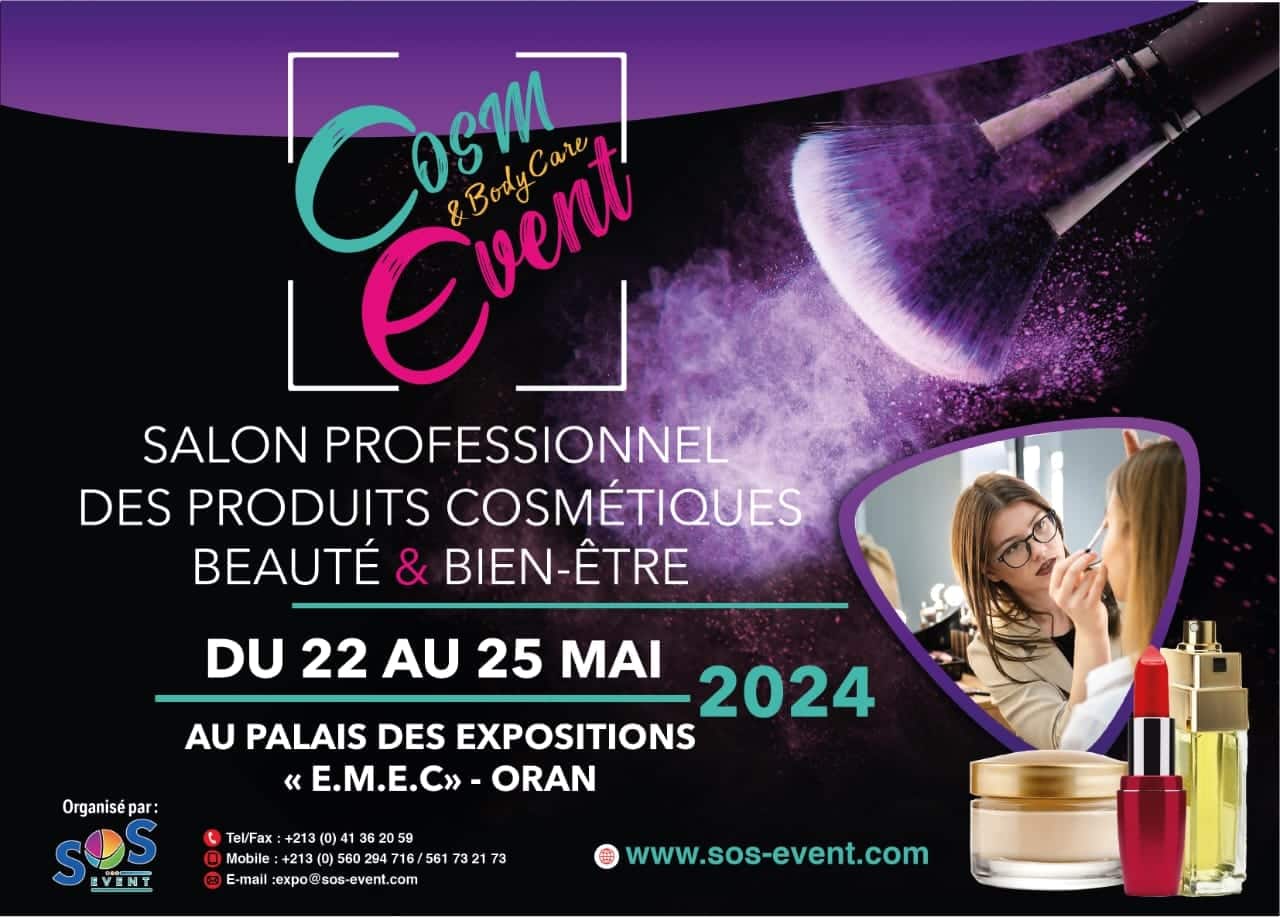 SOS EVENT à l’immense plaisir de vous annoncer la tenue du salon professionnel « COSM-EVENT », salon des Produits Cosmétiques, Beauté & Bien-être qui se tiendra du 22 au 25 Mai 2024 au Palais des Expositions « E.M.E.C » d’Oran