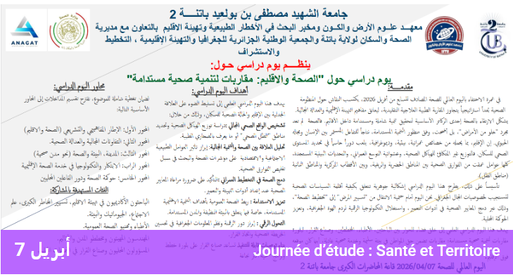 Cette journée d’étude réunit chercheurs, professionnels de la santé publique, urbanistes, décideurs et étudiants pour explorer les liens entre santé et territoire. À travers des conférences, tables rondes et ateliers, l’événement abordera les enjeux de la planification territoriale, l’accès équitable aux soins, les risques environnementaux et les stratégies locales pour améliorer la santé des populations. Une occasion unique de favoriser le dialogue interdisciplinaire et de promouvoir des collaborations concrètes pour des territoires plus sains.