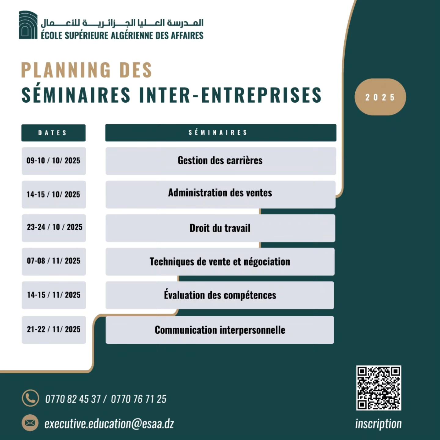 De octobre à décembre 2025, l’École Supérieure Algérienne des Affaires (ESAA) organise une série de séminaires inter-entreprises destinés aux professionnels et aux particuliers désireux d’approfondir leurs connaissances, d’améliorer leurs pratiques et de renforcer leurs performances.