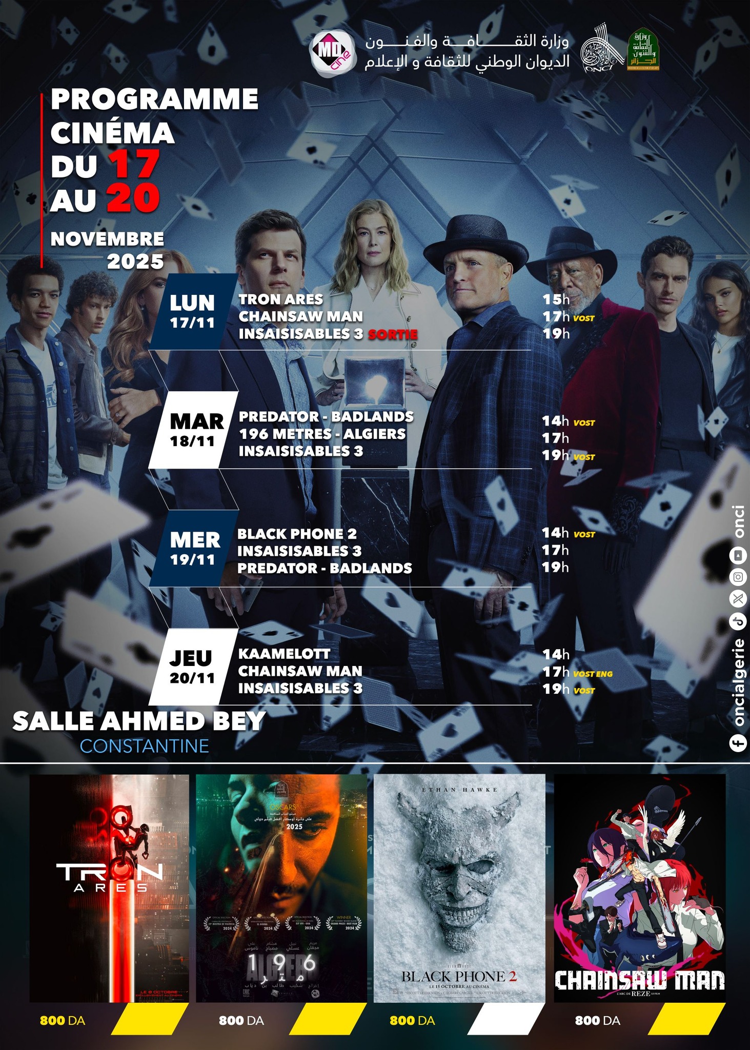 La Salle Ahmed Bey à Constantine propose une programmation cinéma variée pendant quatre jours, avec des films à l’affiche pour tous les goûts : science-fiction, action, horreur et animation. Voici le planning complet :