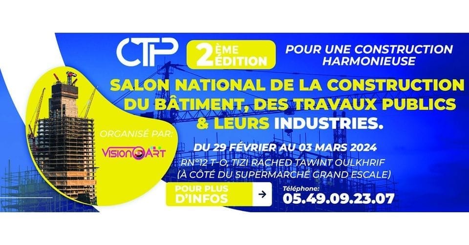 salon de la Construction Du Batiment des Travaux Publics Et Leurs Industries (CTP-2eme Edition) qui aura lieu du 29Février au 03 Mars2024 à INA EXPO Tizi Rached Tizi-ouzou.