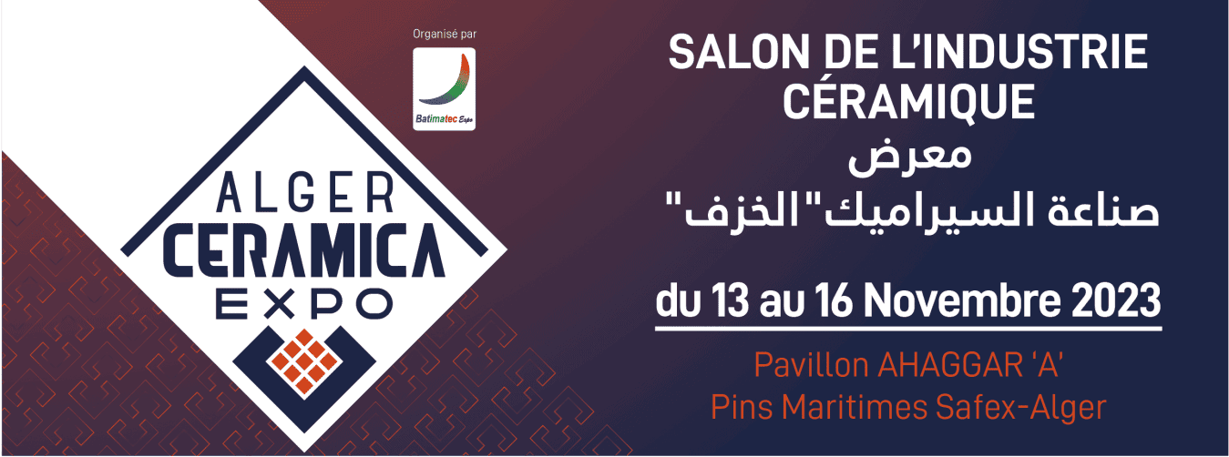 La 2ème édition du salon de l’industrie céramique « ALGER CERAMICA EXPO » organisé par Batimatec Expo, se tiendra du 13 au 16 Novembre 2023 au Palais des Expositions Safex au Pavillon « A ».