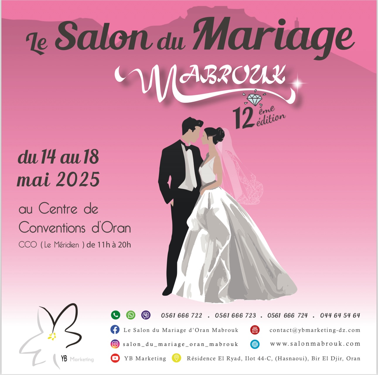 Le Salon du Mariage Mabrouk revient pour sa 12e édition au Centre de Conventions d’Oran. Organisé par l’agence YB Marketing depuis 2013, cet événement incontournable dédié aux futurs mariés et à l’univers du mariage attire chaque année plus de 5 000 visiteurs par jour. Il rassemble plus d’une centaine d’exposants offrant une large gamme de produits et services pour accompagner les couples dans la préparation de leur union.