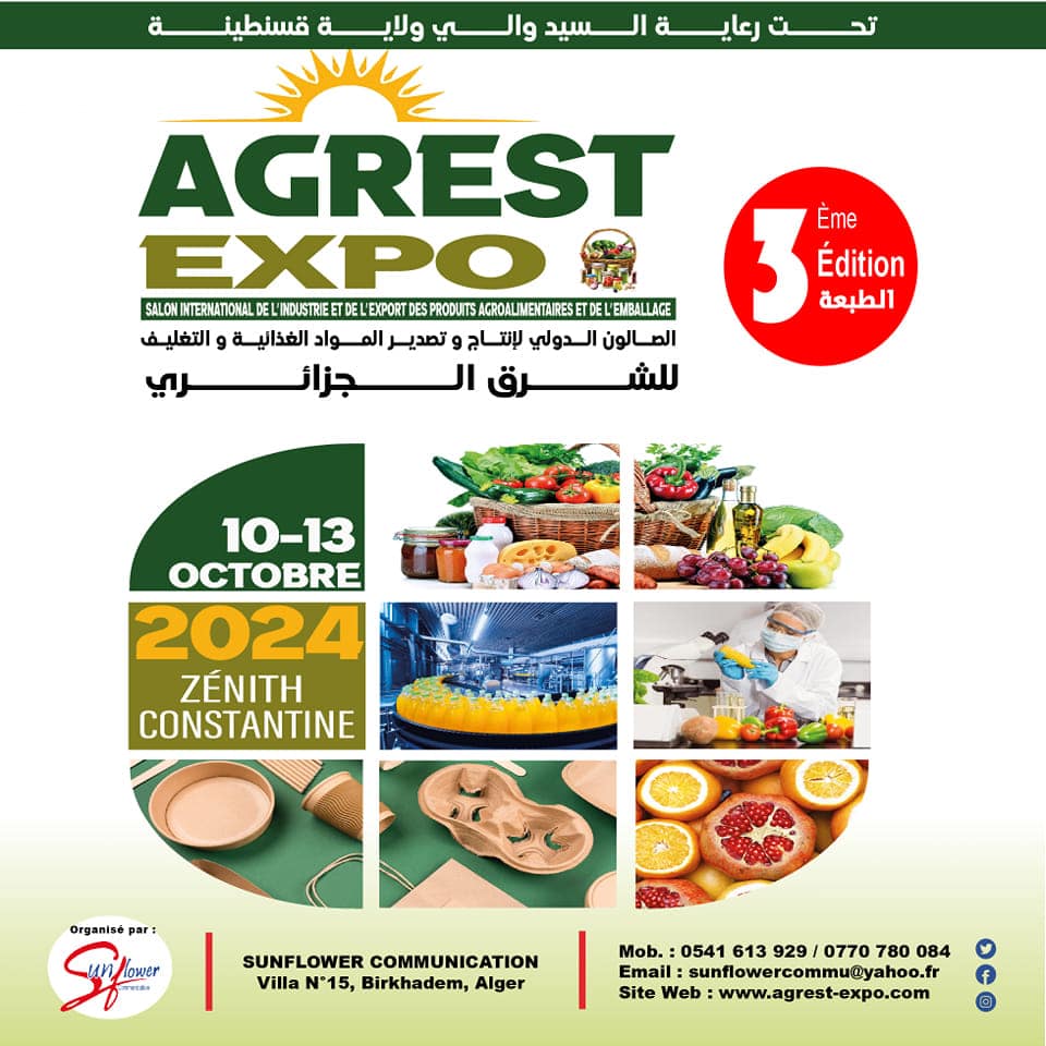 Le salon international de l’Agriculture, de l’Elevage et du Matériel Agricole de l’Est Algérien « Agrest-Expo » tiendra sa troisième édition du 10 au 13 octobre 2024, au Complexe Culturel Ahmed Bey/ Zénith, à Constantine.