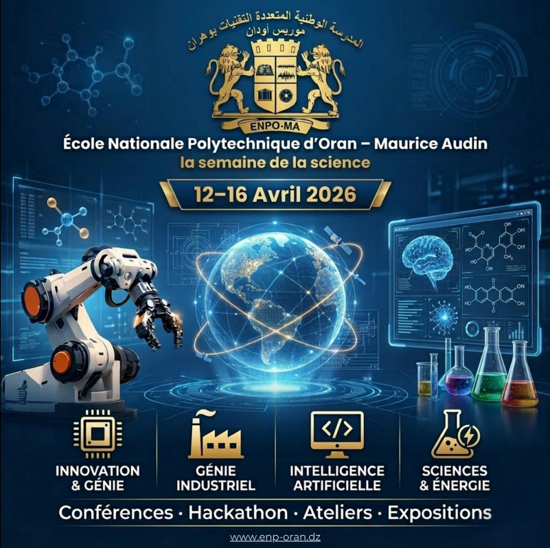 École Nationale Polytechnique d’Oran “Maurice Audin” is organizing a Science Week from 12–16 April 2026 to promote entrepreneurship, innovation and creativity among students and to showcase and valorize student projects. The event includes scientific and technical workshops, academic competitions, hackathon sessions, chess tournaments and a national day dedicated to the valorization of raw materials, organized with the school’s socio‑economic partners.