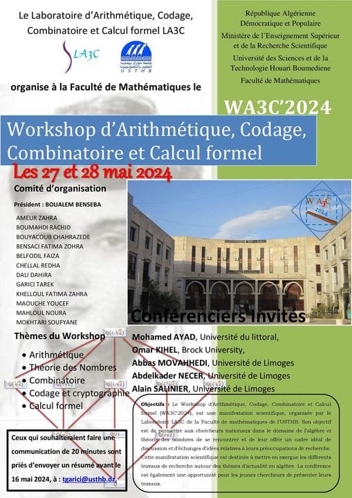 Faculté de Mathématiques : Workshop d’Arithmétique, Codage, Combinatoire et Calcul formel. Les 27 et 28 mai 2024